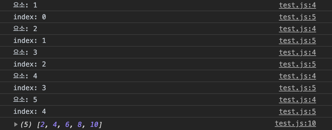 const myArr = [1, 2, 3, 4, 5]; const newMyArr = myArr.map((currentElement, index, array) => { console.log(`요소: ${currentElement}`); console.log(`index: ${index}`); return currentElement * 2 }); console.log(newMyArr); // [2, 4, 6, 8, 10]위 코드를 실행하면 다음과 같은 결과가 출력된다.