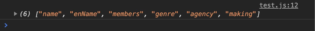 const myObject = { name: '싹쓰리', enName: 'SSAK3', members: ['유두래곤', '린다G', '비룡'], genre: 'Dance & pop', agency: 'MBC', making: '놀면뭐하니?' } const myKeys = Object.keys(myObject); console.log(myKeys); // (6) ["name", "enName", "members", "genre", "agency", "making"]