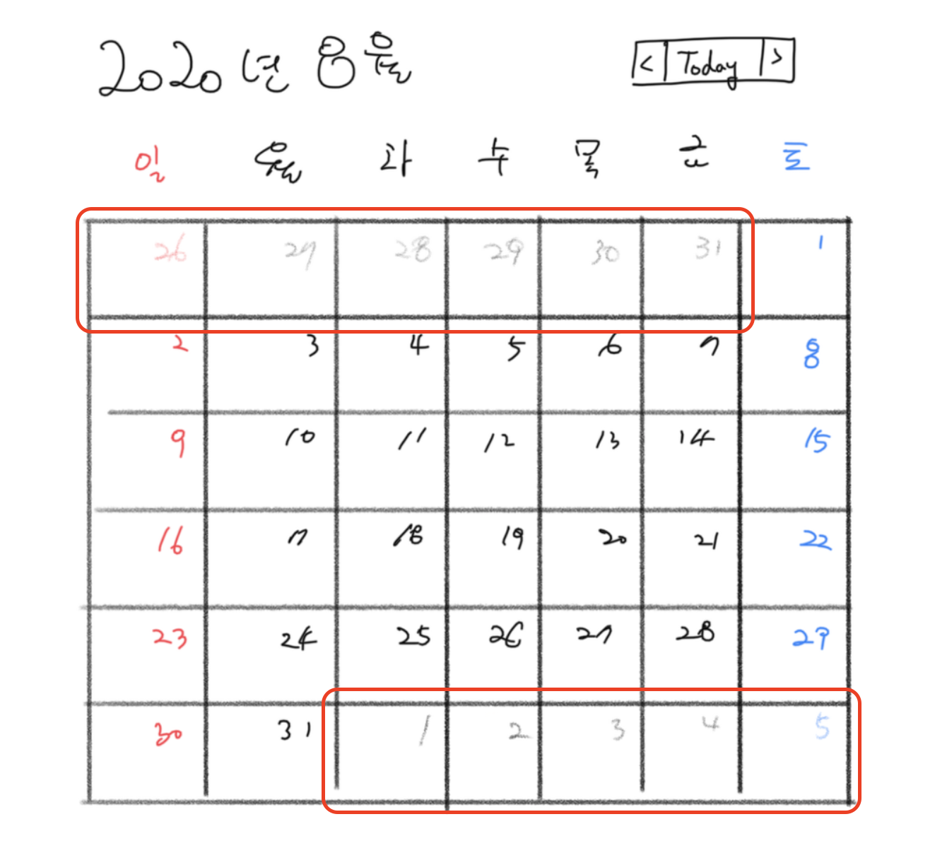 그래서 1번 정보를 통해서 지난 달 날짜 며칠을 몇 개를 그려내야 될지 결정하고