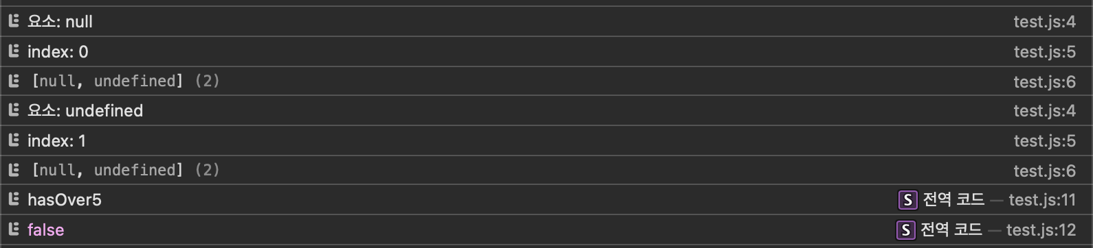const values = new Array(3); const hasOver5 = values.some((currentElement, index, currentArray) => { console.log(`요소: ${currentElement}`); console.log(`index: ${index}`); console.log(currentArray); return currentElement > 5; }); console.log('hasOver5'); console.log(hasOver5); console.log(values); console.log(values.length);