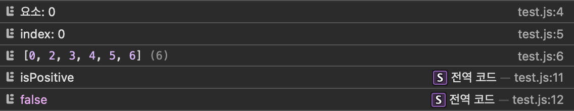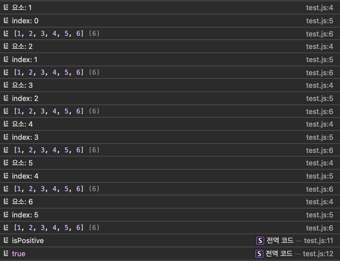 const values = [0, 2, 3, 4, 5, 6]; const isPositive = values.every((currentElement, index, currentArray) => { console.log(`요소: ${currentElement}`); console.log(`index: ${index}`); console.log(currentArray); return currentElement > 0; }); console.log('isPositive'); console.log(isPositive); // ?