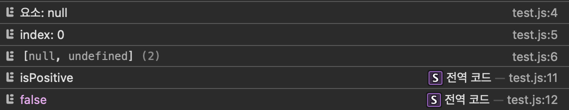 const values = new Array(3); const isPositive = values.every((currentElement, index, currentArray) => { console.log(`요소: ${currentElement}`); console.log(`index: ${index}`); console.log(currentArray); return currentElement > 0; }); console.log('isPositive'); console.log(isPositive); // ?