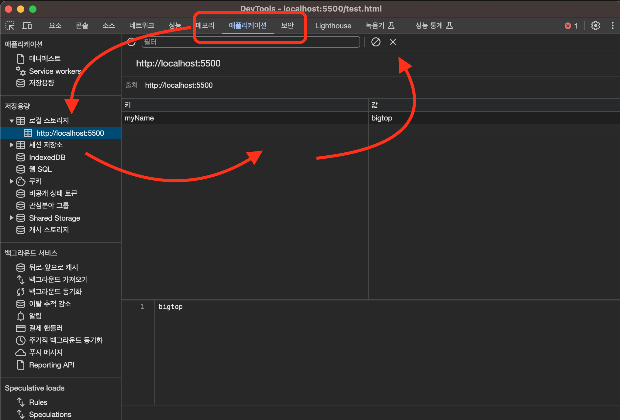 애플리케이션이라는 탭에 들어가면 왼쪽 사이드바에 여러 메뉴들이 있는데 그중에 로컬 스토리지라는 메뉴도 있는 걸 확인할 수 있다.들어가 보면 방금 저장한 값이 있는 걸 확인할 수 있는데, 키-값의 각 테이블 빈 공간을 더블클릭하면 값을 저장할 수 있다.(setItem)